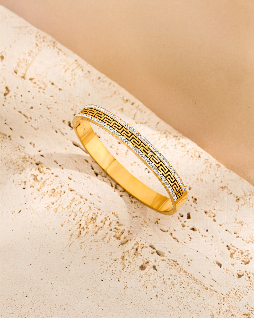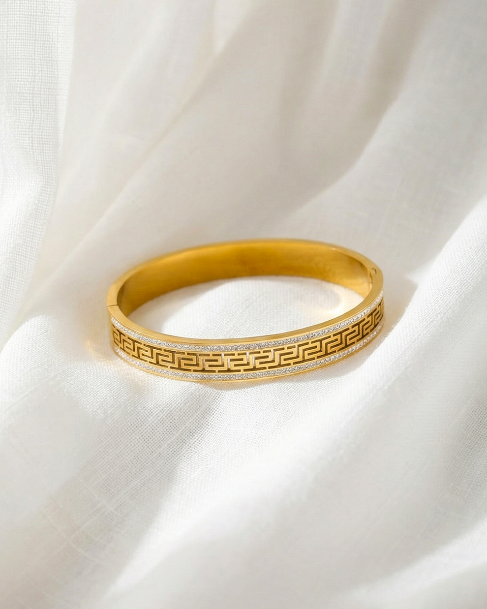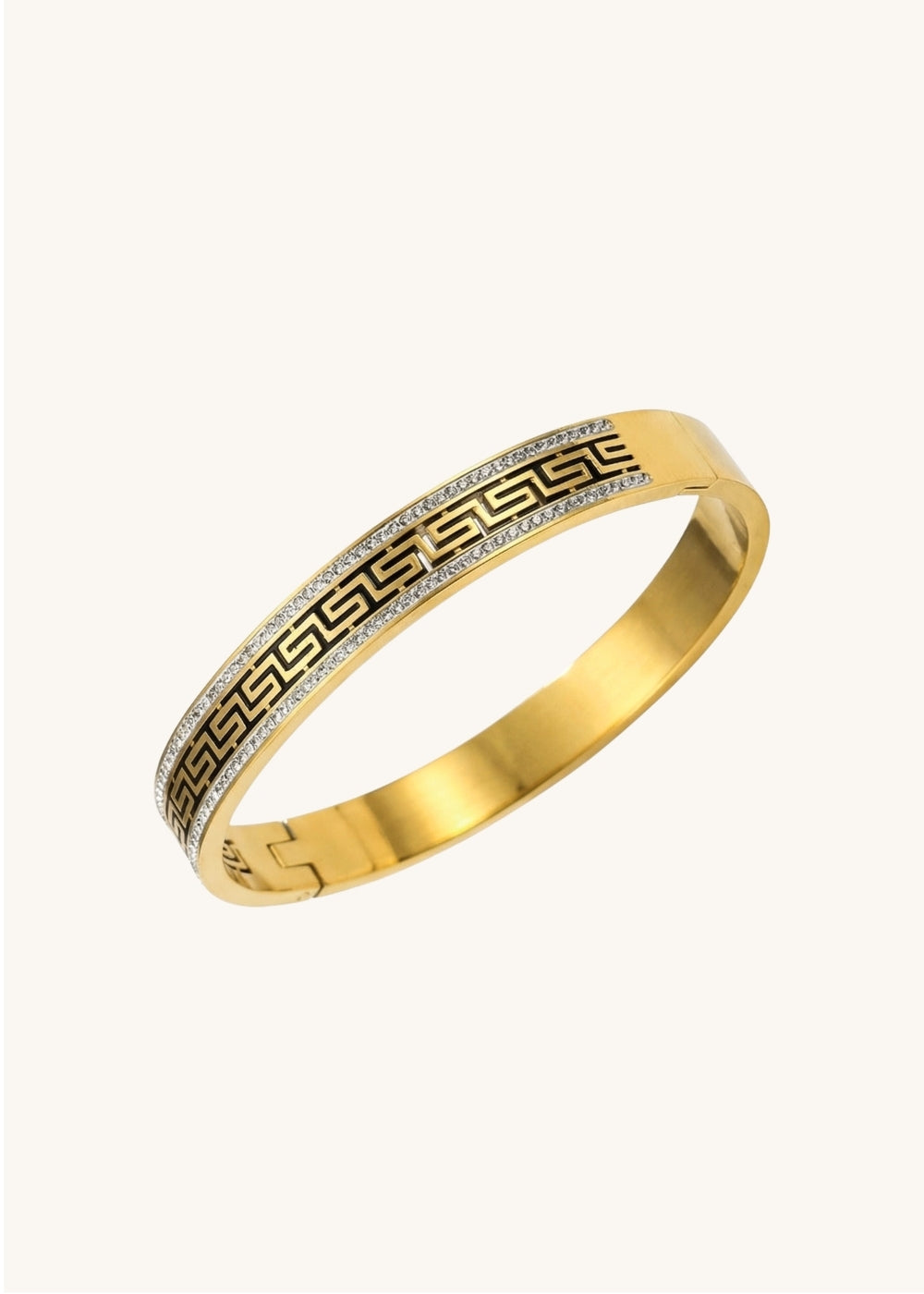 Elevate your everyday style with this sleek gold-toned bracelet, designed to make a subtle yet striking statement. Featuring a bold geometric pattern at the center and delicately studded edges, it perfectly blends modern elegance with timeless charm. Crafted for durability and comfort, this piece is ideal for both daily wear and special occasions—adding a refined touch to every look.