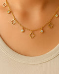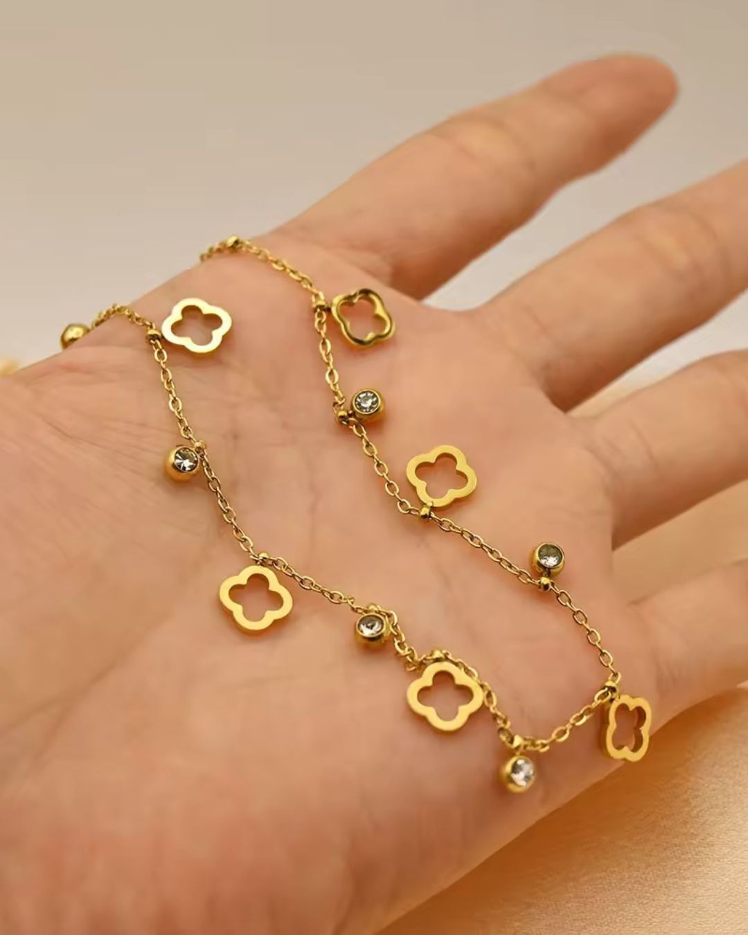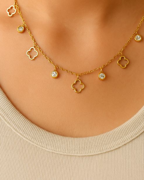 This chic necklace features delicate four-leaf clover charms and sparkling crystals, making it a versatile accessory for any vacation or beach wear.